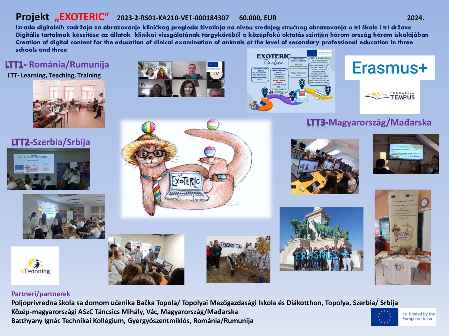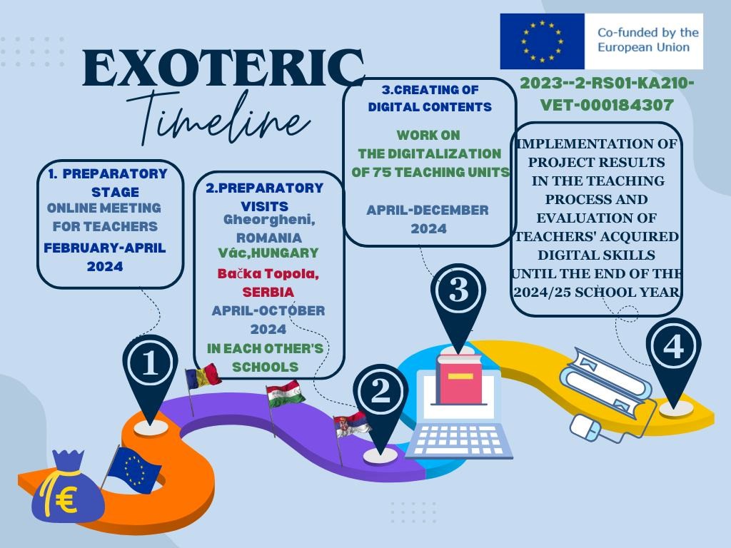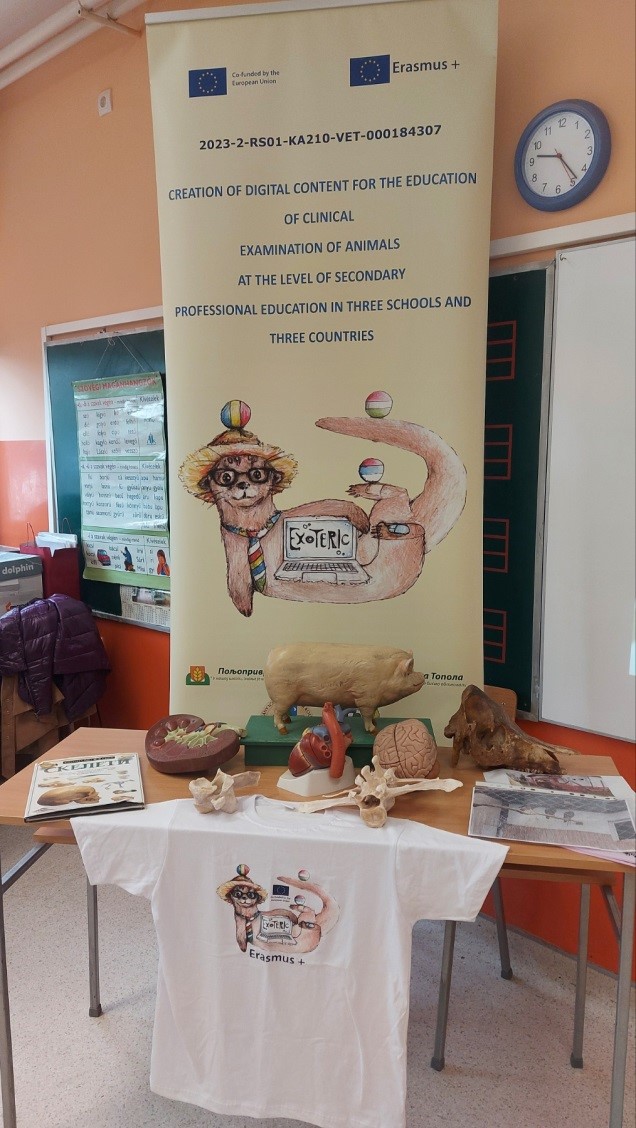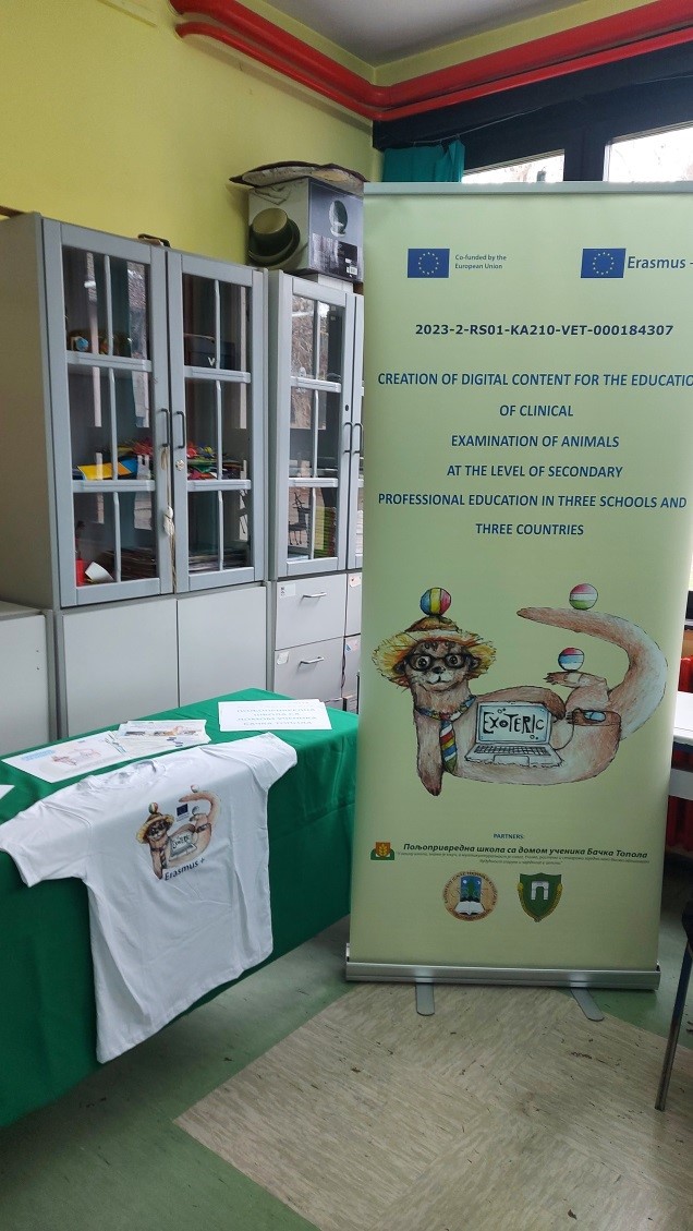 Пројект "EXOTERIC" 2023-2-RS01-KA210-VET-000184307 Израда дигиталних садржаја за образовање клиничког прегледа животиња на нивоу средњег стручног образовања у три школе и три државе- Creation of digital content for the education of clinical examination of animals at the level of secondary professional education in three schools and three”Пројекат су спровеле три школе, из Мађарске, Трансилваније и Србије. Желели смо да промовишемо дигиталну транзицију у нашим институцијама радећи заједно на креирању 75 иновативних, интерактивних, дигиталних садржаја на мађарском, српском и румунском језику који се могу користити у свакодневном образовању. Наше резултате смо учинили доступним на веб страници школе, којој сви могу слободно приступити.Наши партнери у пројекту су, Пољопривредна техничка стручна школа и колegijum „Танчич Михаљ“ у Вацу и Румунска стручна школа „Батијањи Игнанц“ у Ђерђесентмиклошу. Циљ партнерства је међусобно учење. На стручним састанцима, институције су се упознале са образовним системима својих земаља, са посебном пажњом на институције чланице.Кратак приказ пројекта је на следећој слици. Поред онлајн састанка, одржана су три састанка у школама три земље, где су пројектни задаци подељени међусобно, разматрани су захтеви наставног плана и програма, припремљени су интерактивни наставни материјали уз активно учешће ученика, а затим су тестирани у образовању. Наша школа је креирала дигитални уџбеник на веб страници, који је доступан свима, у интерес квалитетног образовања. Следећа слика сумира главне моменте пројекта. Главни циљ пројекта био је да се наставни материјали учине доступним не само партнерским школама, већ и школама у Србији.Учесници пројекта, и ученици и наставници, високо су проценили пројекат, сматрали га великим изазовом, били су посвећени, редовни и активни током пројекта. Проширили су своје знање, развили своје вештине и ојачали сарадњу. Квалитет пројектног рада огледа се у презентацијама и другим производима који су произведени. Сарадња између школа је знатно ојачана. Постоји могућност да се пројекат настави и развије на нивоу школе. Пројекат је учесницима пружио знање које се може користити дугорочно. Волимо да делимо своја искуства стечена током Еразмус+ пројеката са другима. Учествујемо на разним образовним сајмовима, где поносно представљамо наше резултате. Захваљујемо се Фондацији Темпус Еразмус+ што је веровала у вредност нашег пројекта и што је својом подршком подржала његову реализацију! „Финансирано средствима Европске уније. Изражена становишта представљају искључиво становишта аутора и не одражавају нужно ставове Европске уније. Ни под којим условима се Европска унија ни давалац наменских бесповратних средстава не могу сматрати одговорнима за њихову садржину.“Линк за документације пројекта